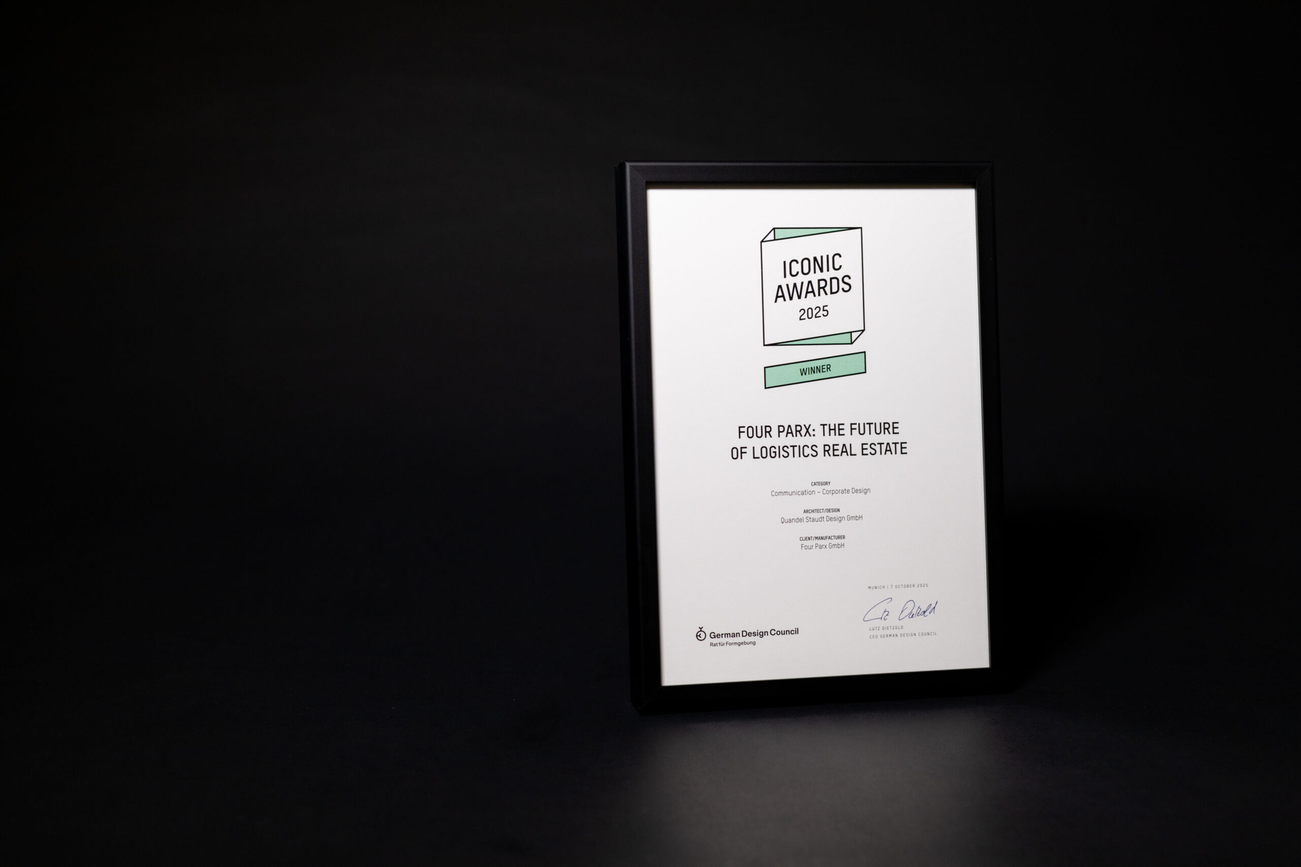 Ausgezeichnet wurde das von uns entwickelte Erscheinungsbild für Four Parx – ein Branding, das für Vision, Verantwortung und Zukunftsfähigkeit in der Logistikimmobilien-Branche steht.