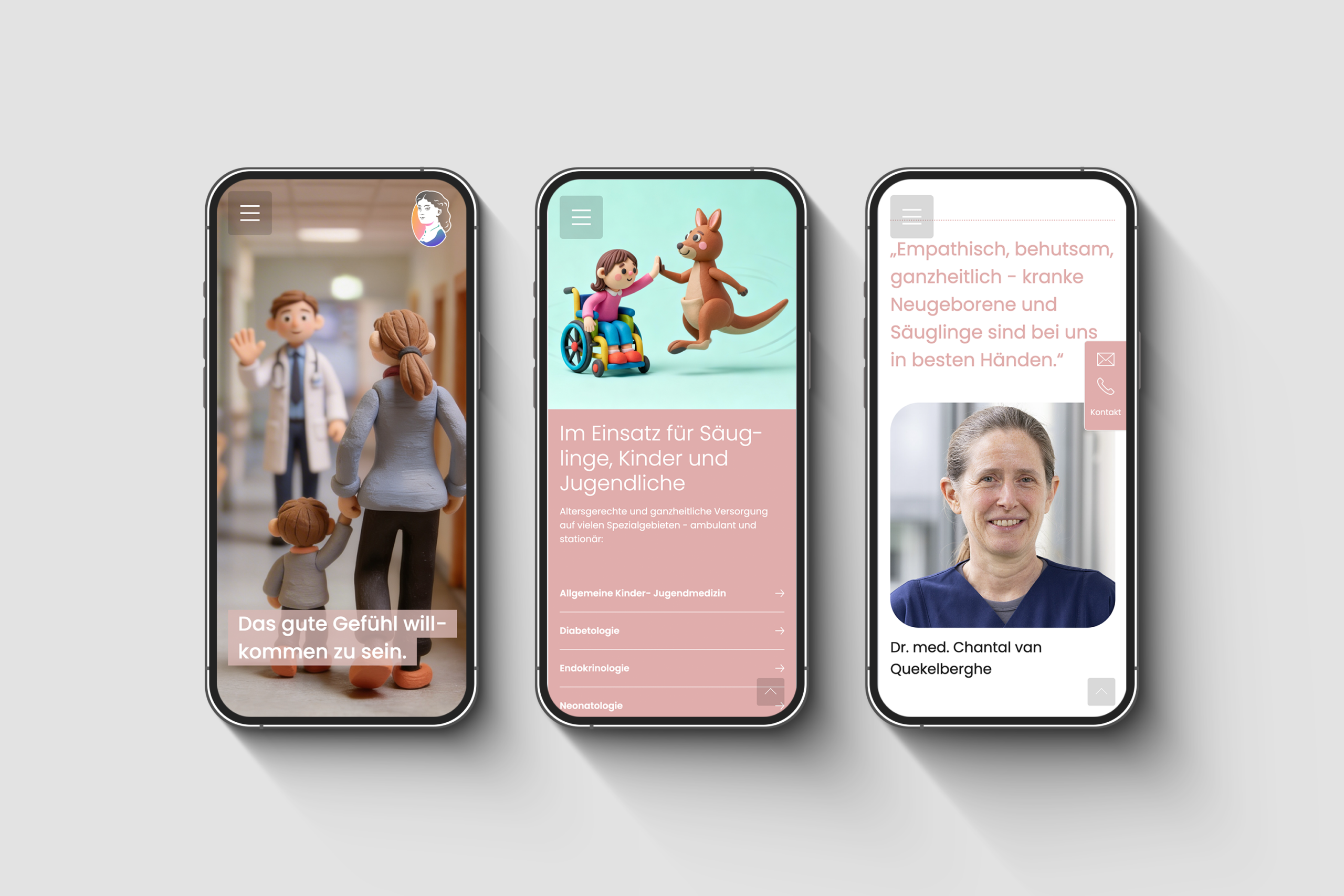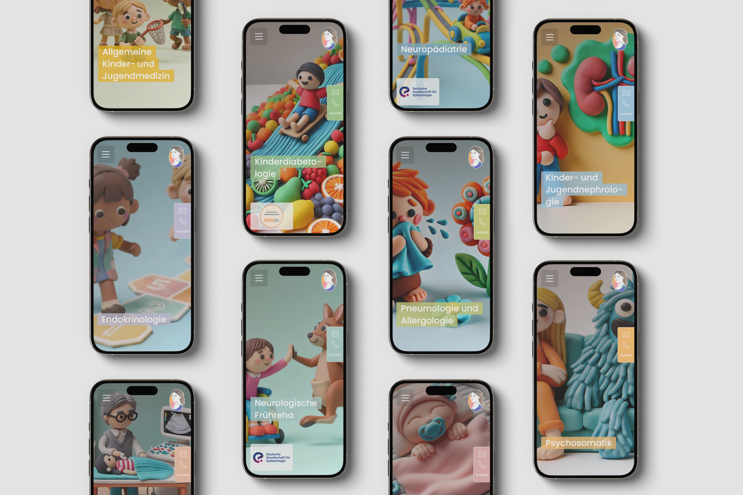 Die Informationsarchitektur erleichtert den Zugang zu Fachbereichen, Angeboten und Ansprechpartnern und unterstützt Eltern bei einer oft sensiblen Entscheidung: der Wahl der richtigen Klinik. Ein klares Farbsystem strukturiert die Inhalte und schafft Wiedererkennung über alle Bereiche hinweg. Gleichzeitig wurde die Bildwelt neu gedacht: Aus Illustrationen entstehen dreidimensionale, KI-gestützte Knetwelten, die medizinische Themen spielerisch übersetzen, Ängste reduzieren und komplexe Inhalte zielgruppengerecht illustrieren.