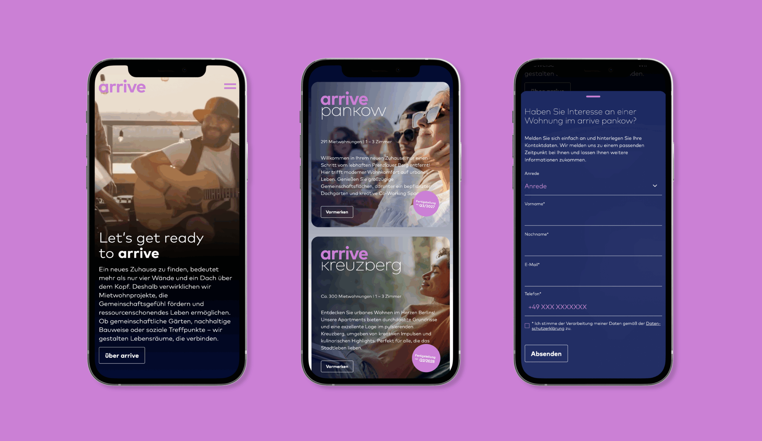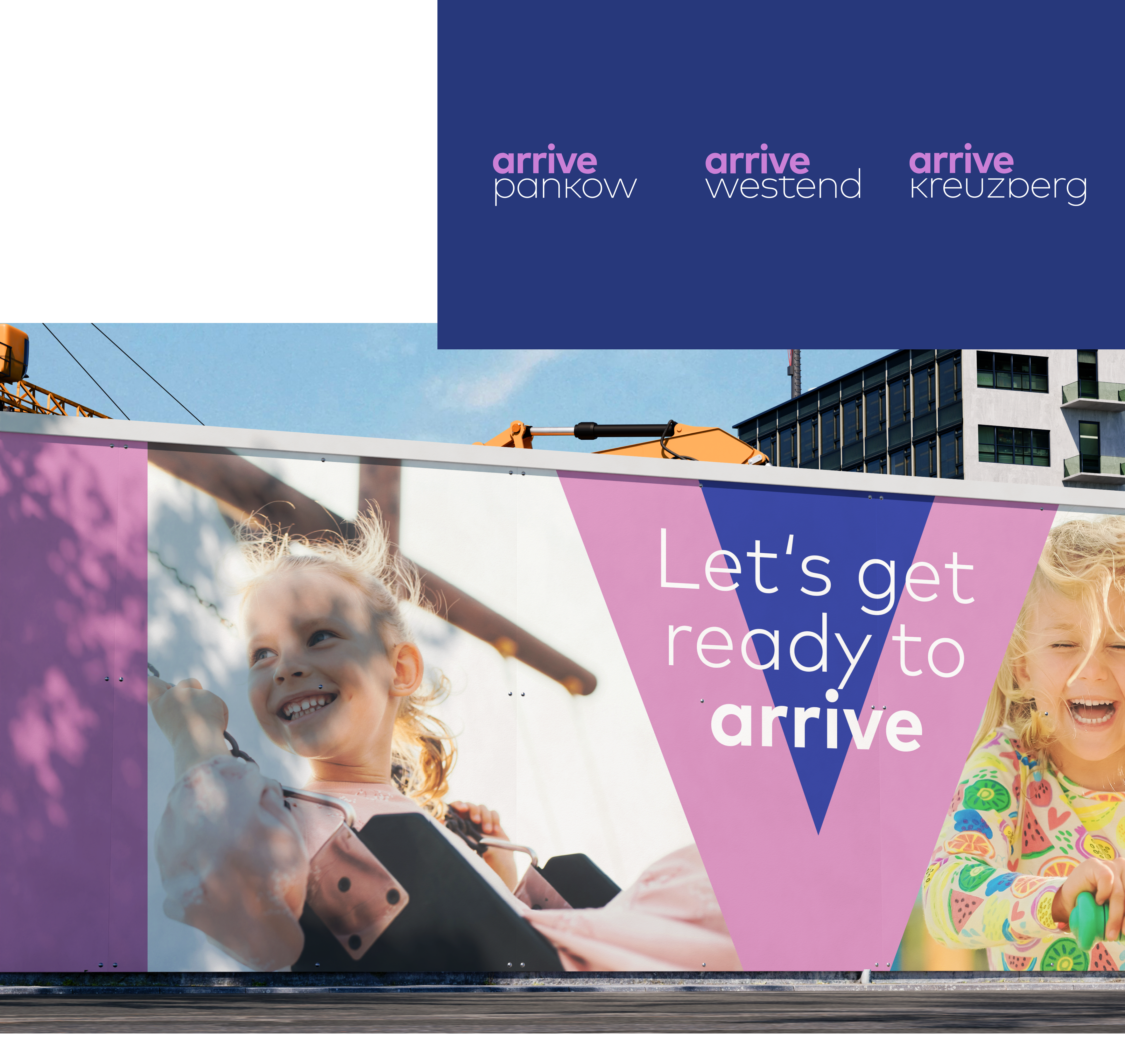 Das Designsystem ist unverwechselbar und flexibel auf die unterschiedlichen Quartiere anwendbar. Die Bildsprache und Farbwelt sind jung, energiegeladen, emotional und bieten eine Identifikationsbasis für die Zielgruppen: junge Singles, urbane Paare oder kleine Familien.  Die Subbrands wie arrive Pankow oder arrive Kreuzberg besitzen jeweils eine eigene Identität, bleiben jedoch klar in der arrive-Dachmarke verankert. So entsteht ein konsistentes, wiedererkennbares Markensystem, das auf jede Lage und jedes Quartier präzise eingehen kann.